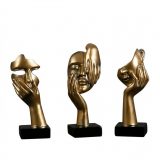 A compelling set of three surrealist sculptures in a matte golden finish, each depicting a fragmented human face cradled or covered by hands in poses of silence, thought, and peace, all mounted on solid black pedestal bases.