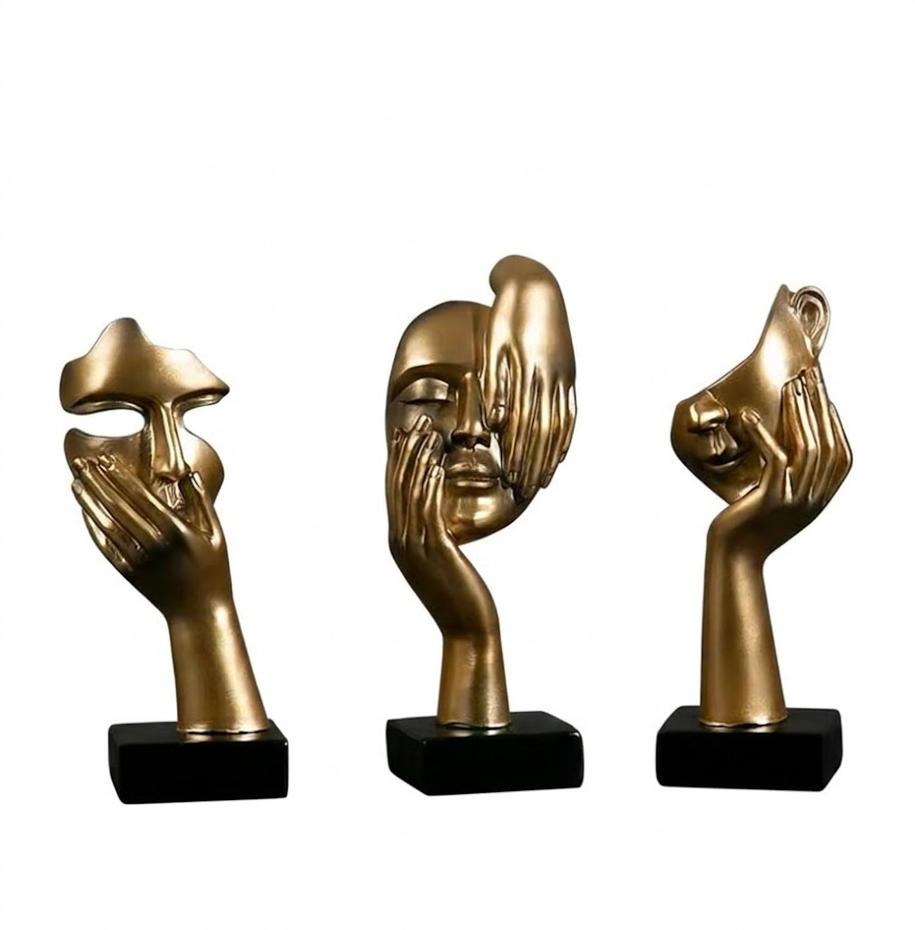 Make a profound artistic statement with the “Silence & Reflection” Golden Mask Trio. Drawing inspiration from modern surrealism, these showpieces capture deep human emotions through abstract forms. Each piece tells a different story: the “Silent Observer” with a hand over the mouth, the “Deep Dreamer” with eyes peacefully closed, and the “Hidden Soul” partially veiled by a hand.