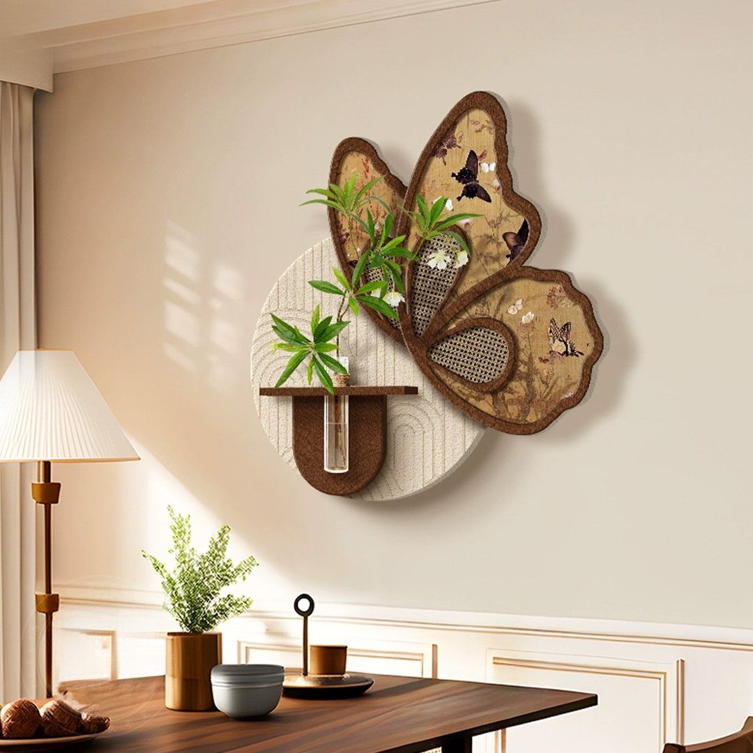 A large, decorative wall-mounted showpiece featuring a complex butterfly silhouette with intricate floral and mesh patterns. It is layered over a textured circular backing and includes a small integrated shelf with a glass propagation tube holding live green foliage.