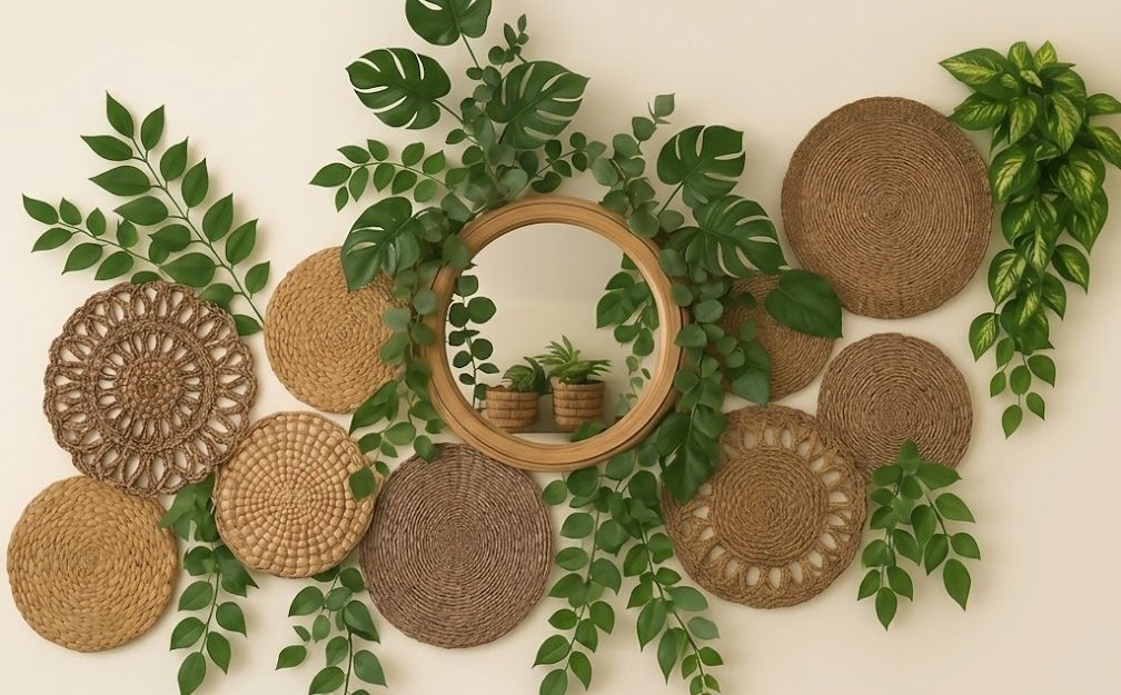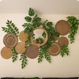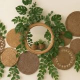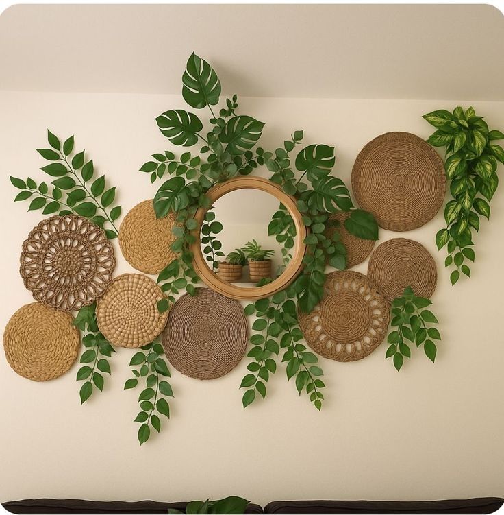 Handcrafted bohemian wall decor featuring a round wooden mirror surrounded by woven rattan baskets and lush green foliage accents. Perfect for adding warmth, texture, and a natural touch to your living room, bedroom, or entryway.