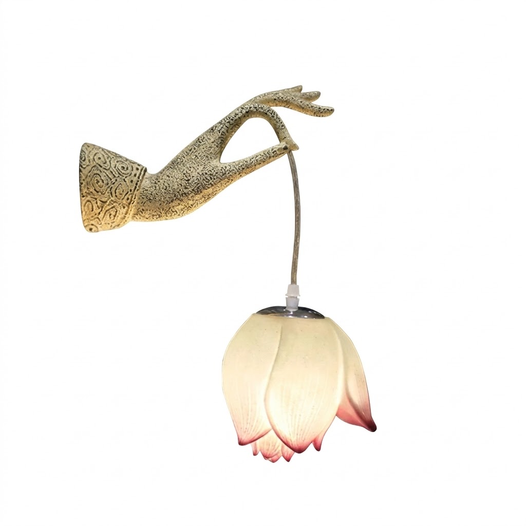 An ornate, wall-mounted light fixture featuring a sculpted hand in a traditional “Gyan Mudra” pose, elegantly holding a delicate, blooming lotus flower lampshade that emits a soft, warm glow.