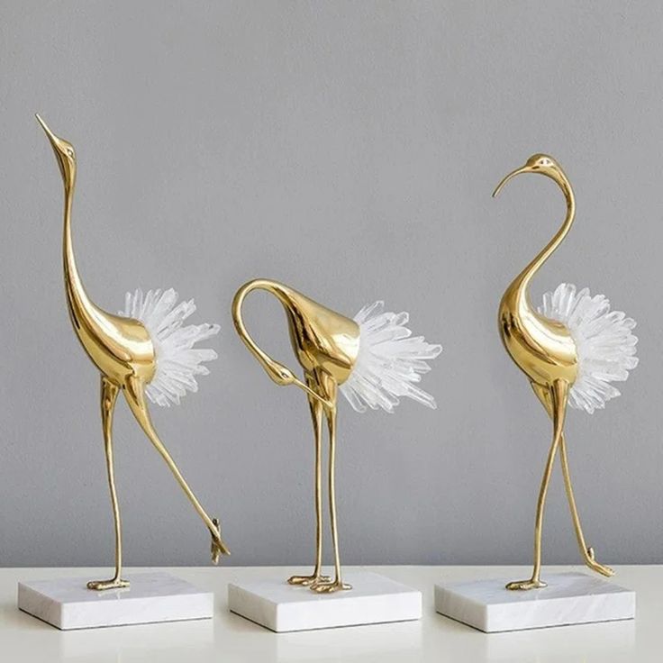 A trio of elegant, long-necked heron figurines finished in polished gold. Each bird is uniquely posed on a white marble pedestal and features a dramatic, spiked clear crystal cluster as its tail plumage.