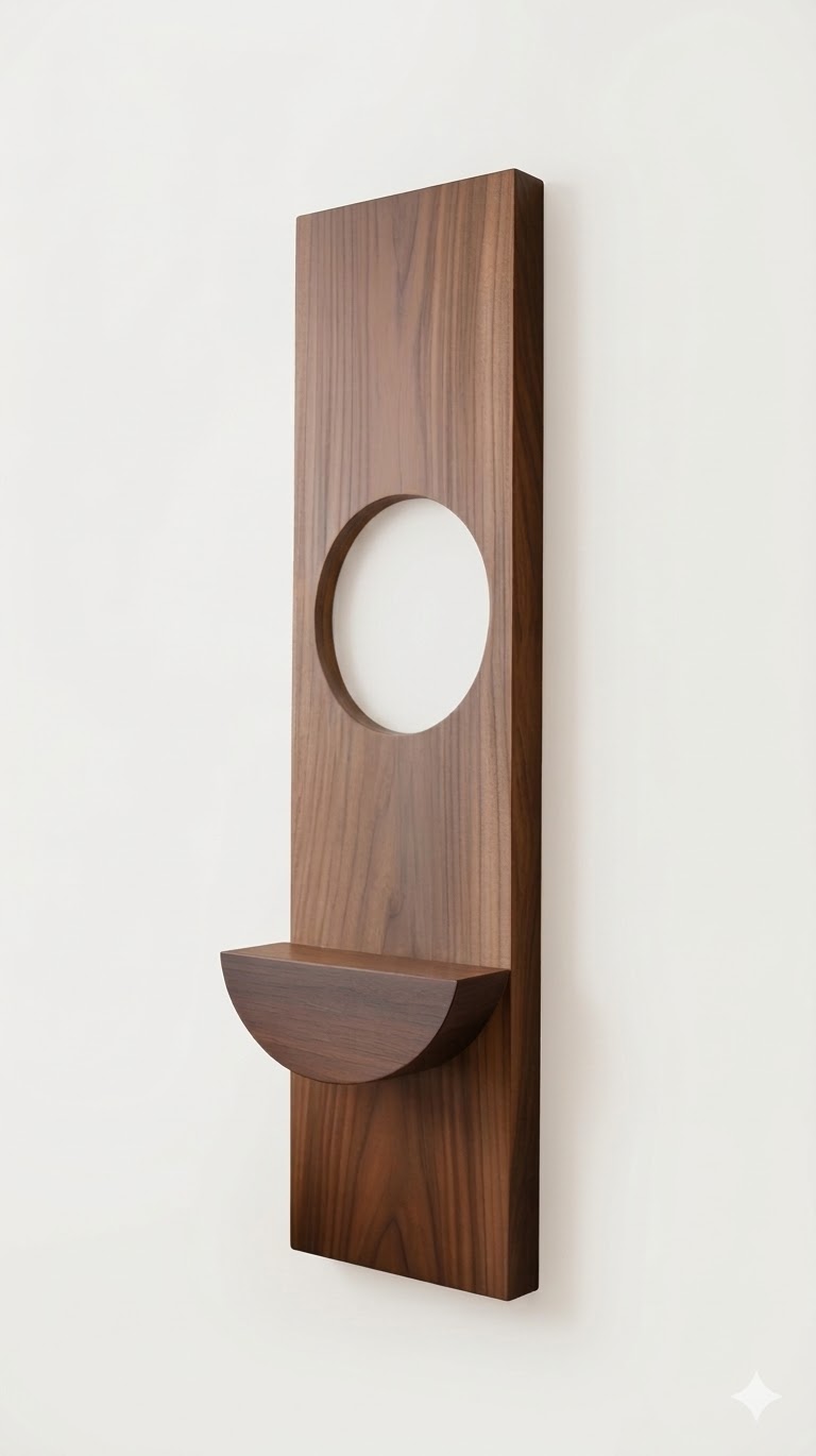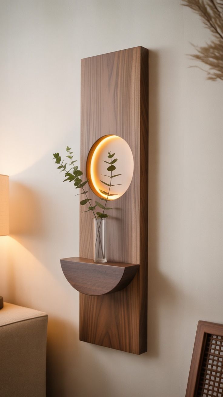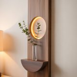 This elegant Nordic-style wooden wall lamp combines warm ambient lighting with a minimalist decorative shelf. Crafted from natural wood, the design features a circular LED light embedded in the wooden panel, creating a soft halo glow.