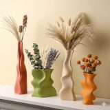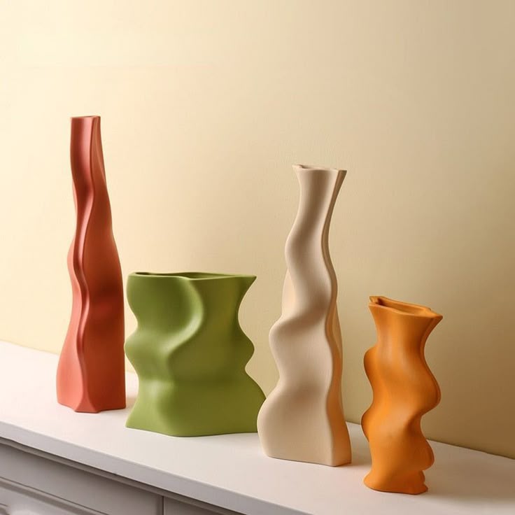 A set of four modern ceramic vases with a wavy, curvy silhouette in matte earth tones (terracotta, sage, cream, and mustard) arranged together against a neutral background.
