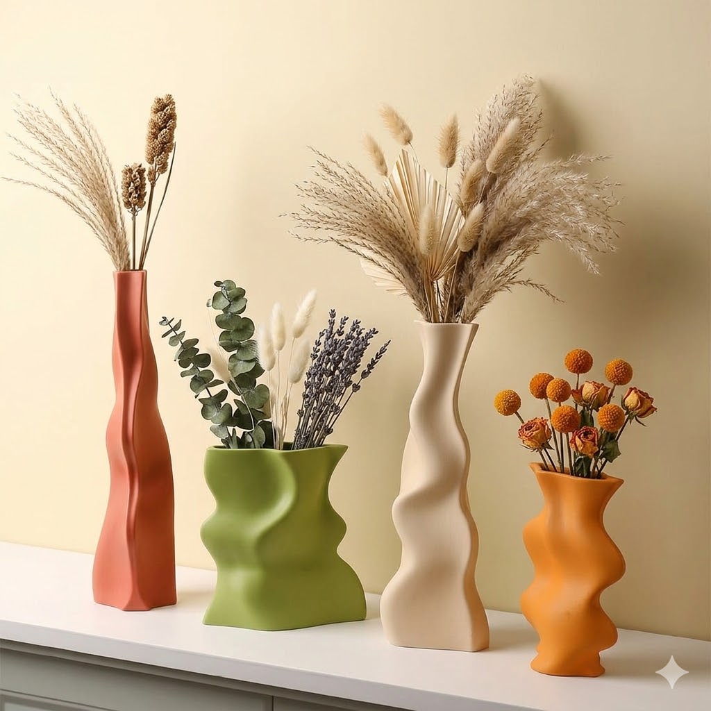 Elevate your living space with our Aura Collection, a set of four sculptural vases designed for the modern minimalist. Each piece features a unique, flowing “wavy” silhouette that mimics organic forms found in nature. Crafted from high-quality ceramic with a premium matte finish, these vases serve as sophisticated standalone art pieces or the perfect vessels for dried pampas and minimalist floral stems.