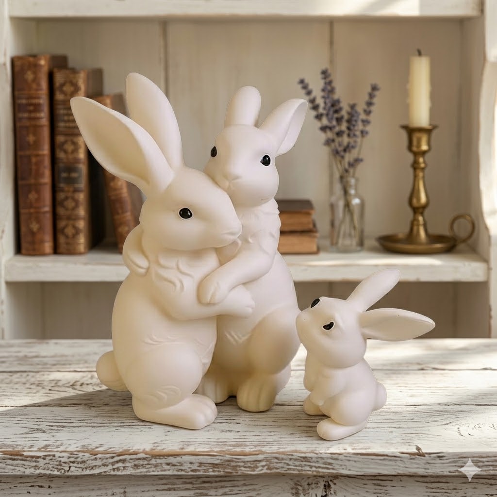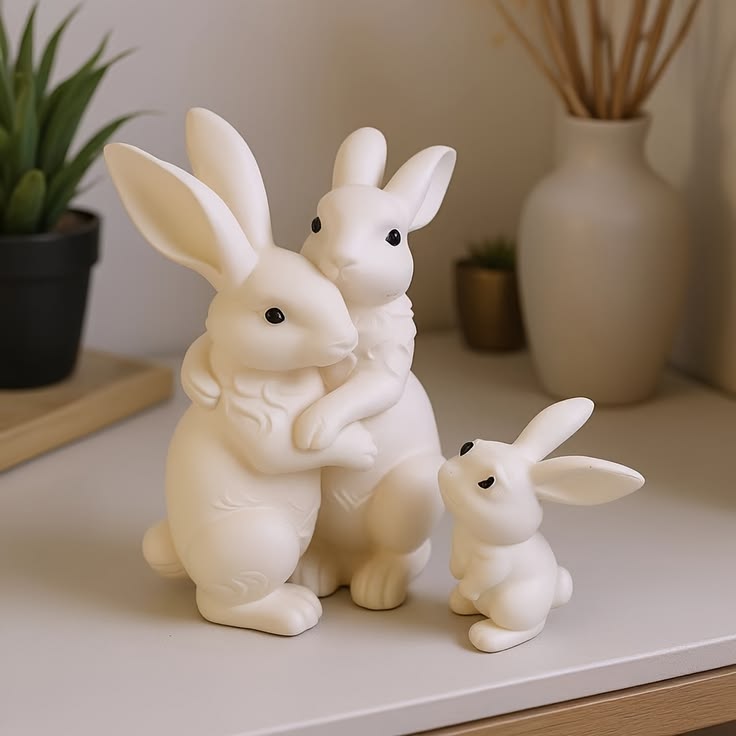 Celebrate the bond of family and affection with this heartwarming collection. The “Hugging Rabbits” set captures a tender embrace in a minimalist, sculptural style. Their soft, matte cream finish and smooth contours make them a calming addition to a bedroom, nursery, or living room shelf.